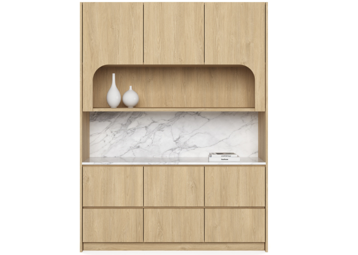 Bria represents a meticulously designed wall unit that provides functionality as a dry kitchen space or a breakout service utility area, seamlessly blending elegant curves and a marble-like finish for a sophisticated storage solution.